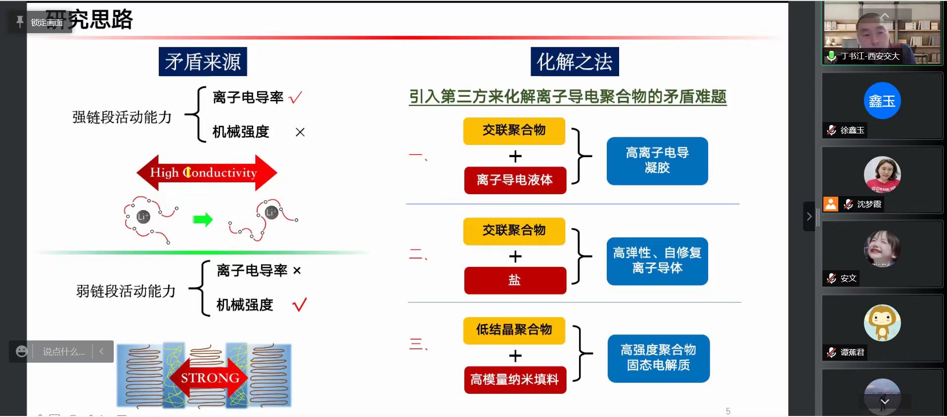 丁書江教授從課題組的研究工作出發(fā),分別從凝膠類離子導(dǎo)電聚合物、無溶劑的離子導(dǎo)電彈性體、低結(jié)晶度高聚物/高強(qiáng)度納米填料復(fù)合聚合物固態(tài)電解質(zhì)、集成化固態(tài)電池四個方面詳細(xì)地做了報告,為同時提高離子導(dǎo)電聚合物的機(jī)械強(qiáng)度和離子傳輸性質(zhì)提供了新的思路,并對高性能離子導(dǎo)電聚合物材料的發(fā)展進(jìn)行了展望。