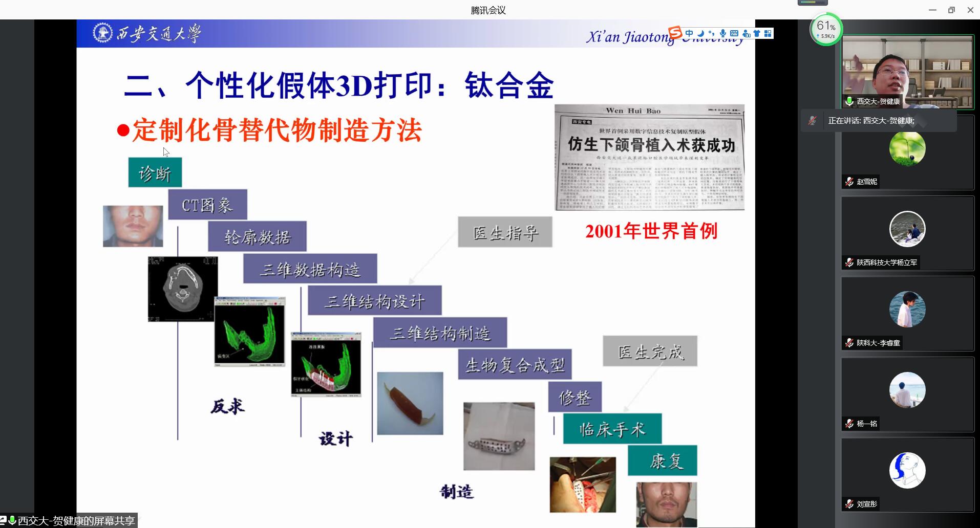 賀健康從3D打印的醫(yī)學(xué)應(yīng)用、個性化假體3D打印、可降解支架3D打印、微納生物3D打印四個方面,講解了國內(nèi)外生物3D打印領(lǐng)域的研究前沿和發(fā)展動態(tài)。對相關(guān)研究方向在申請國家自然科學(xué)基金時如何緊跟國內(nèi)外生物3D打印領(lǐng)域前沿、獨辟蹊徑、深挖科學(xué)問題提供了建設(shè)性的思路。通過他們團(tuán)隊科研成果落地醫(yī)院臨床應(yīng)用的大量實例,講述了科學(xué)家、醫(yī)生、工程師如何成功合作,服務(wù)人類健康,挽救患者生命及提高人民生活質(zhì)量,貢獻(xiàn)生物3D打印科研人員的力量。對我校生物3D打印研究服務(wù)陜西地方經(jīng)濟(jì),加快裝備與產(chǎn)品產(chǎn)業(yè)化應(yīng)用帶來了寶貴經(jīng)驗。最后,賀健康在3D打印與臨床醫(yī)學(xué)結(jié)合、假體制造、支架與活性器官制造宏微結(jié)構(gòu)一體化、3D打印技術(shù)等醫(yī)工交叉領(lǐng)域如何創(chuàng)新性地開展科研給出了可操作性的建議。報告不僅對學(xué)院生物3D打印領(lǐng)域技術(shù)研究具有重要的借鑒和指導(dǎo)意義,同時對學(xué)院仿生制造技術(shù)與理論學(xué)科方向發(fā)展及博士點建設(shè)具有重要的促進(jìn)作用。