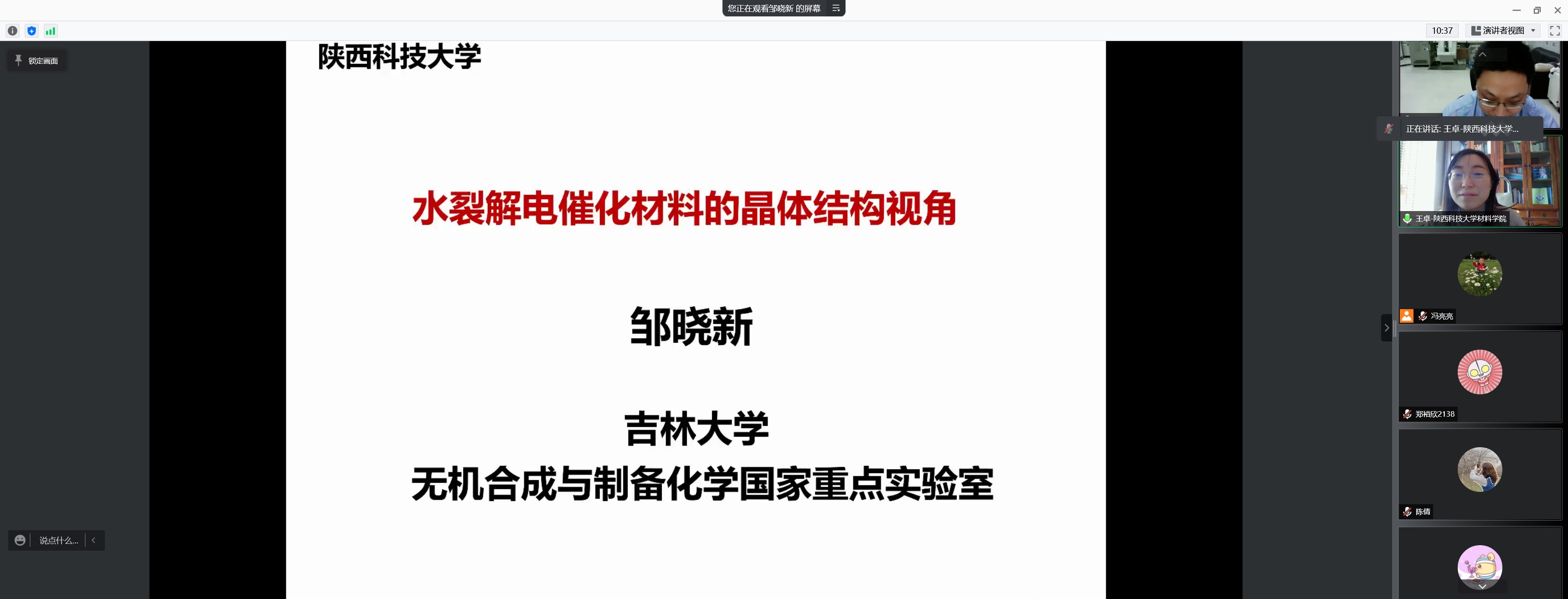 1月15日下午,應(yīng)我校材料科學(xué)與工程學(xué)院邀請,吉林大學(xué)鄒曉新教授做客我?!扒把乜茖W(xué)報告”,作了題為“水裂解電催化材料的晶體結(jié)構(gòu)視角”的線上學(xué)術(shù)報告。報告由材料學(xué)院副院長王卓主持,我校部分教師及相關(guān)專業(yè)研究生參加了本次報告。
