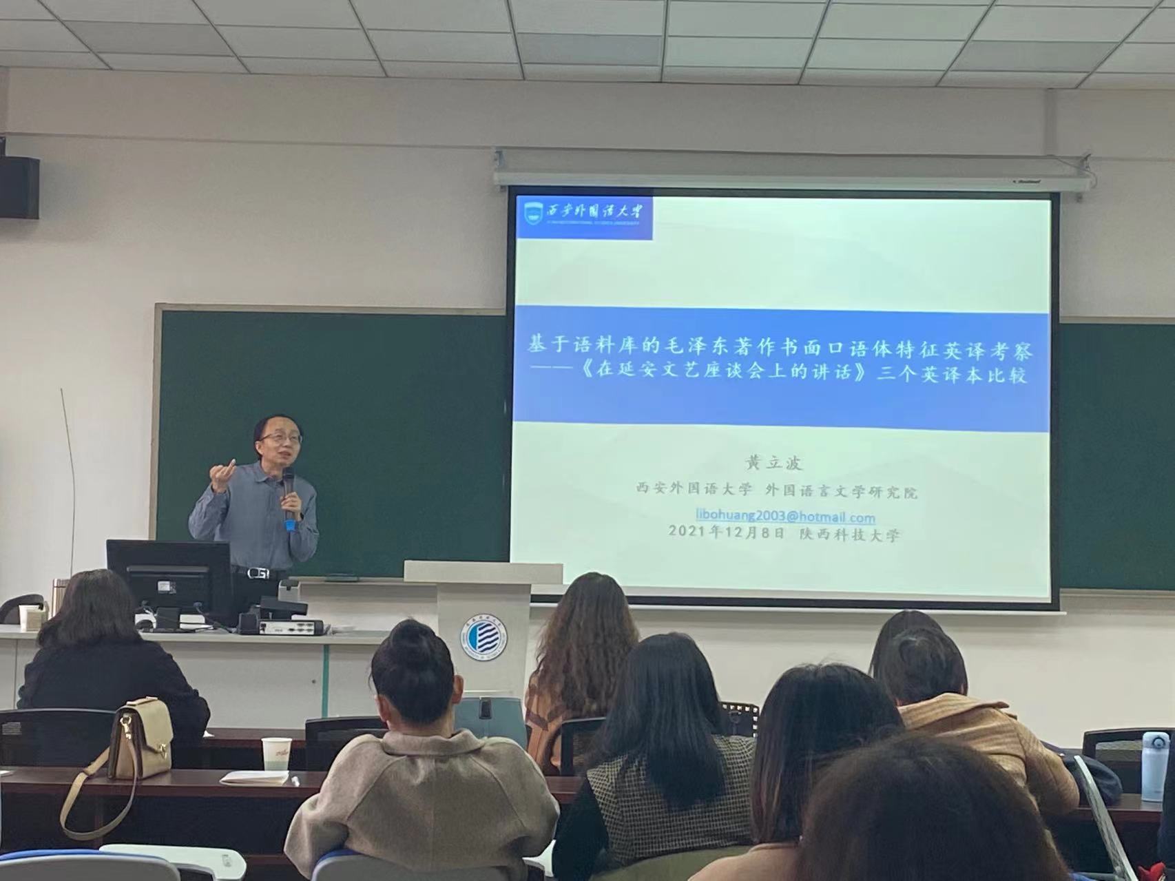12月8日下午,應(yīng)文理學(xué)院邀請,西安外國語大學(xué)黃立波教授做客我校前沿科學(xué)報(bào)告,作了題為《基于語料庫的毛澤東著作書面口語體特征英譯考察——<在延安文藝座談會上的講話>三個(gè)英譯本比較》的報(bào)告。報(bào)告由外語系主任李俊葉主持,外語系教師和翻譯專業(yè)研究生聆聽了此次報(bào)告。