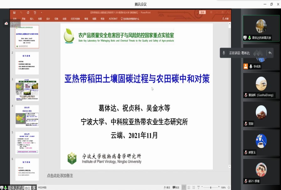 11月30日,受我??萍继幖碍h(huán)境科學(xué)與工程學(xué)院邀請,寧波大學(xué)葛體達(dá)教授作客我?!扒把乜茖W(xué)報告”,并以“亞熱帶稻田土壤固碳過程與農(nóng)田碳中和對策”為題,圍繞目前“雙碳”熱點話題作了一場精彩的學(xué)術(shù)報告,環(huán)境學(xué)院師生及其他兄弟院校、科研院所師生共計230多人在線參加了會議。會議由環(huán)境學(xué)院副院長李成濤主持。