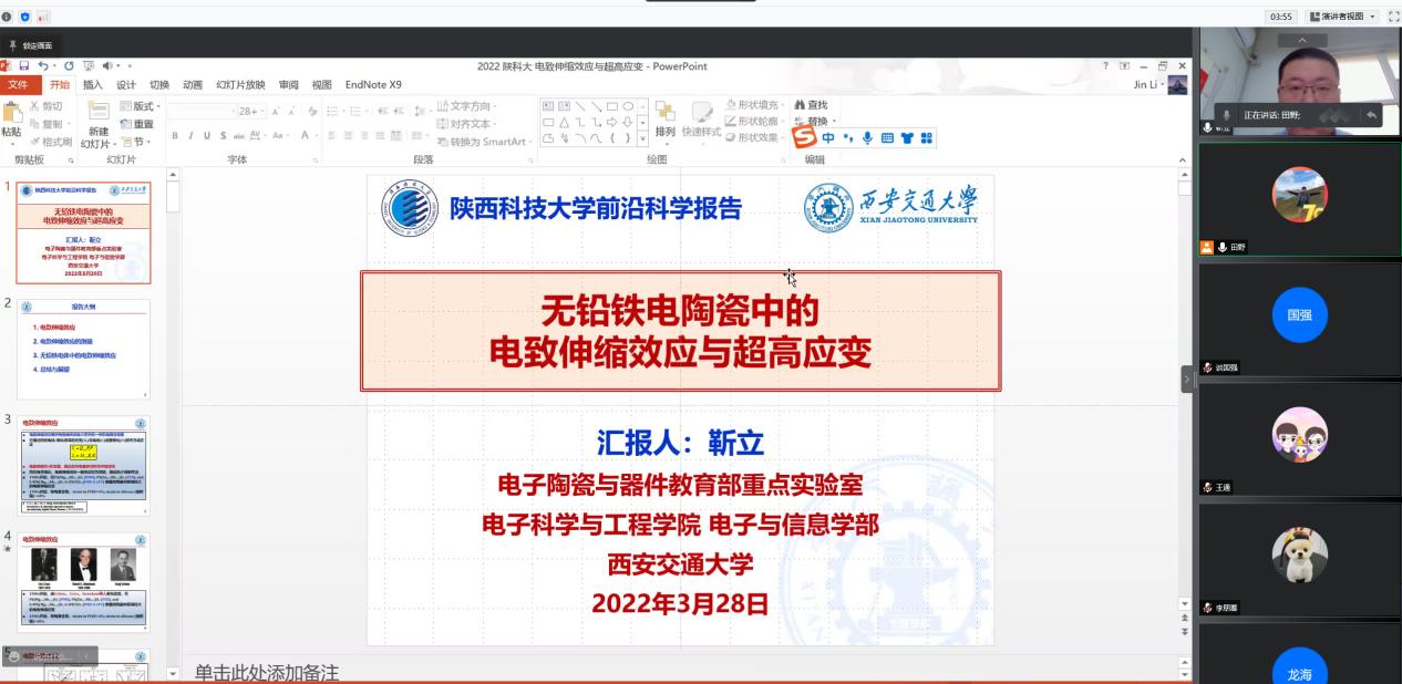 3月28日,應(yīng)材料科學(xué)與工程學(xué)院、科技處和前沿院邀請,西安交通大學(xué)電信學(xué)部主任助理、博士生導(dǎo)師靳立教授來我校,作了題為“無鉛鐵電陶瓷中的電致伸縮效應(yīng)和超高應(yīng)變”的前沿科學(xué)報(bào)告。報(bào)告采用線上形式舉行,報(bào)告由材料學(xué)院院長朱建鋒教授主持。