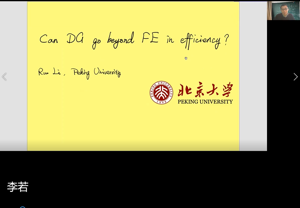 報告會上,李若教授以基本的泊松方程為例,首先介紹了有限元方法(FE)與間斷Galerkin方法(DG)的實現(xiàn)形式,同時提出了有限元方法實現(xiàn)過程中計算量較小的優(yōu)點;然后提出如何比較兩種方法的效率,即相同自由度個數(shù)條件下,誤差較小的效率較高,從而導出通過比較系數(shù)來比較效率的方式;最后,李若教授提出了一種通過構(gòu)造新的空間得到新的DG方法,隨著次數(shù)的增大,該方法的效率比FE方法高,由于理論證明幾乎不可能實現(xiàn),李若教授便給大家展示了大量數(shù)值實驗的結(jié)果體現(xiàn)了該方法的效率。