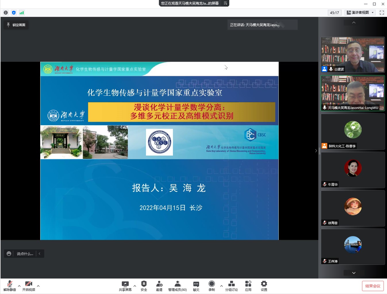 吳海龍教授從數(shù)學(xué)分離的研究背景及初衷、高維數(shù)陣多線性分解的相對分解唯一性、高維數(shù)陣多線性分解的相對循環(huán)對稱性、高維模式識(shí)別初步認(rèn)識(shí)、張量代數(shù)的基本意義及代表性運(yùn)算規(guī)則以及數(shù)學(xué)分離與綠色分析化學(xué)發(fā)展前景等七個(gè)方面展開講解。結(jié)合課題組研究特色深入淺出的介紹了發(fā)展三維及更多維分析儀器響應(yīng)數(shù)陣數(shù)學(xué)分離分析新方法、新策略。