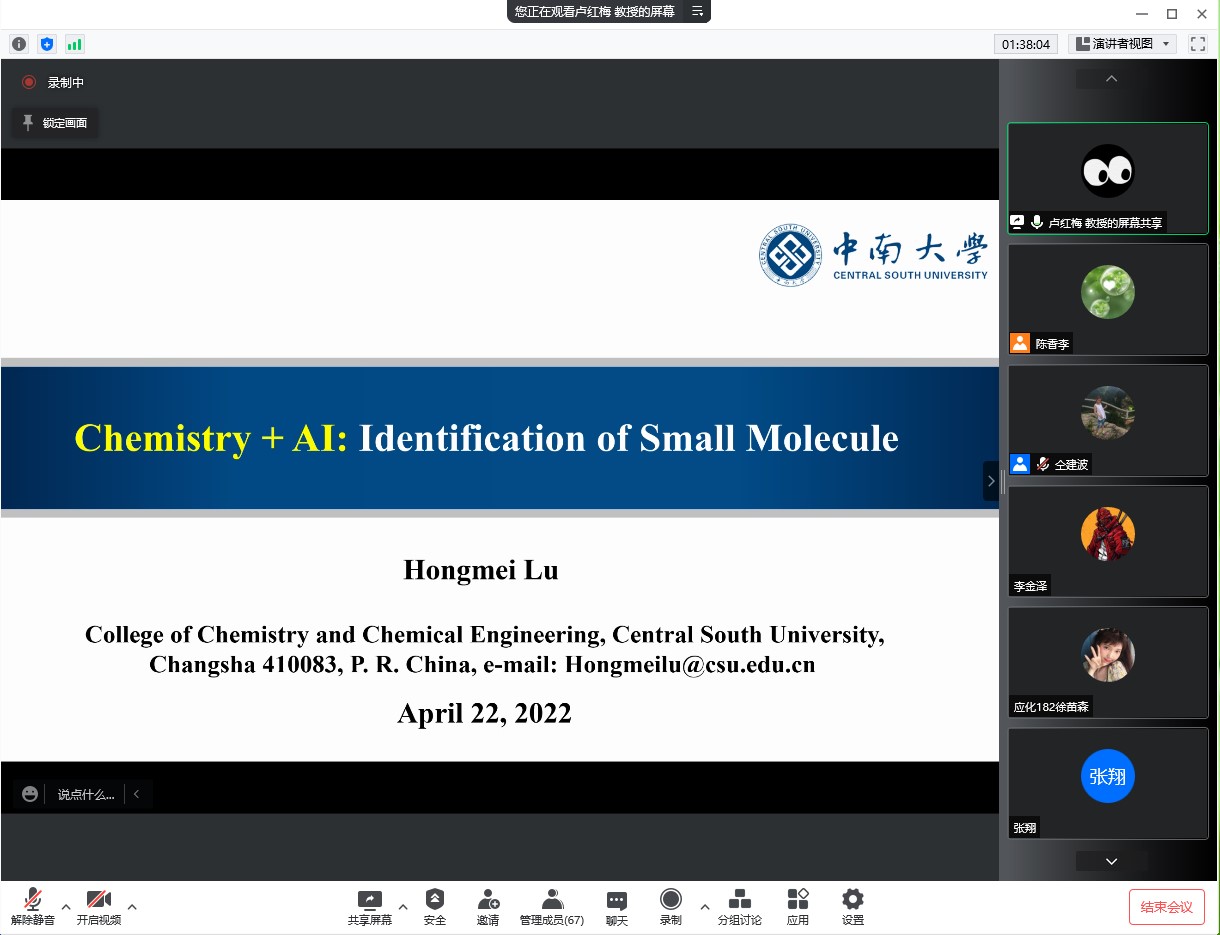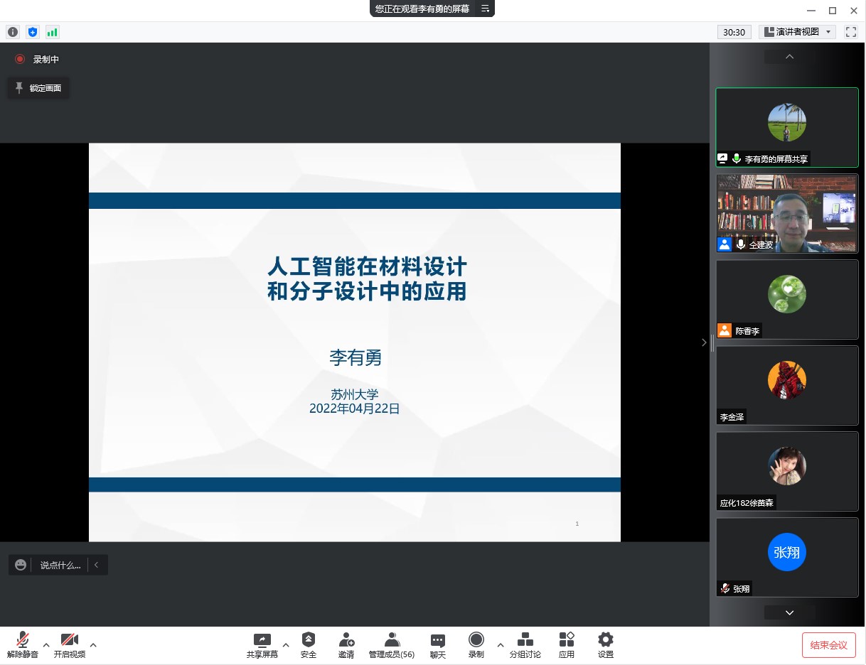4月22日,應(yīng)我??萍继?、前沿院及化學與化工學院邀請,蘇州大學李有勇教授和中南大學盧紅梅教授做客我校“前沿科學報告”,作了題為“人工智能在材料設(shè)計和分子設(shè)計中的應(yīng)用”和“Chemistry + AI: Identification of Small Molecule”的報告。報告會由化工學院副院長仝建波主持,學院相關(guān)專業(yè)教師、研究生聆聽了此次報告會。