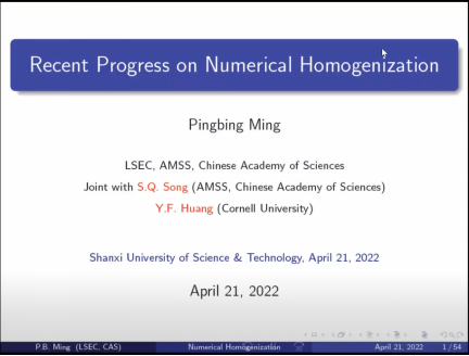4月21日上午,應(yīng)數(shù)學(xué)與數(shù)據(jù)科學(xué)學(xué)院邀請(qǐng),中國(guó)科學(xué)院數(shù)學(xué)與系統(tǒng)科學(xué)研究院明平兵研究員做客我?!扒把乜茖W(xué)報(bào)告”,作了題為“RecentProgressonNumericalHomogenization”的學(xué)術(shù)報(bào)告。本次報(bào)告由數(shù)學(xué)院長(zhǎng)李劍主持,部分教師及全體研究生參加此次報(bào)告。