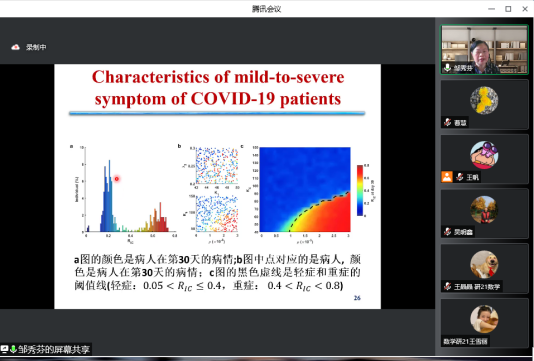 報(bào)告會(huì)上,鄒秀芬教授圍繞數(shù)據(jù)驅(qū)動(dòng)的數(shù)學(xué)建模和定量分析展開,將數(shù)學(xué)建模與多維數(shù)據(jù)分析相結(jié)合,以探索COVID-19患者的異質(zhì)性進(jìn)展,并確定癌癥微環(huán)境的關(guān)鍵因素。主要介紹了SARS-CoV-2感染的動(dòng)態(tài)過程,I型干擾素控制COVI-19病人從無癥狀到有癥狀的轉(zhuǎn)變,COVI-19患者的輕度至重度癥狀的特征,以及治療效果和預(yù)后。建立的多尺度模型能夠?qū)鴥?nèi)外的COVI-19患者數(shù)據(jù)進(jìn)行有效分析,并且對(duì)于患者的用藥給出定量標(biāo)準(zhǔn)分析,對(duì)于醫(yī)院在給不同癥狀病人用藥方面能夠很好地指導(dǎo)。此外,鄒教授針對(duì)我院教師關(guān)心的新冠肺炎建模研究問題和后續(xù)合作開展研究課題展開了積極討論,并給出了一些建議和指導(dǎo),這為進(jìn)一步提升學(xué)院學(xué)科研究水平具有重要意義。