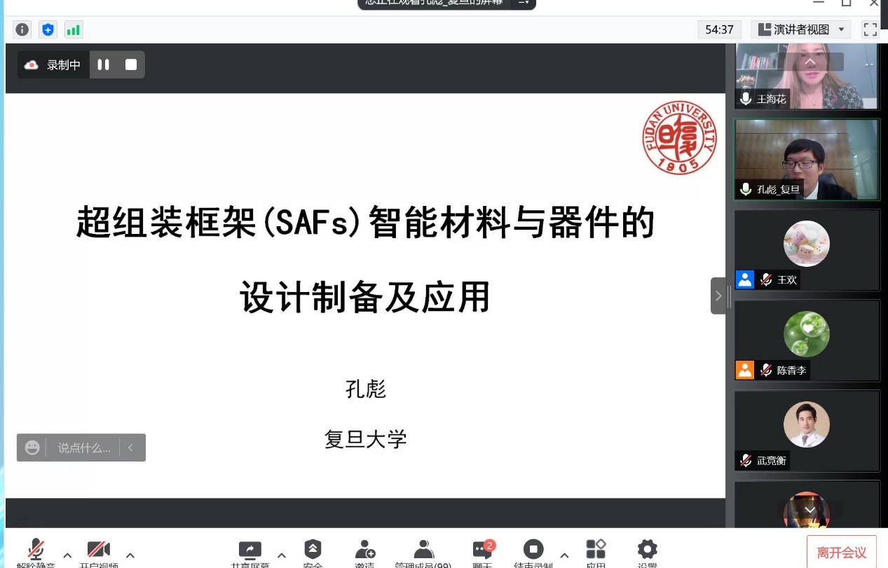 孔彪教授針對超組裝框架(SAFs)材料設計合成,SAFs智能納米通道在分子感知中的應用,SAFs智能微納米界面在生物診療中的應用以及SAFs在一體化可穿戴器件中的應用四個方面展開詳細介紹,構建了多種超組裝的智能材料與器件。