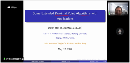 5月12日,應(yīng)數(shù)學(xué)與數(shù)據(jù)科學(xué)學(xué)院邀請(qǐng),北京航空航天大學(xué)韓德仁教授做客我校前沿科學(xué)報(bào)告,通過(guò)騰訊會(huì)議作了題為“SomeExtendedProximal Point Algorithms with Applications”的線上報(bào)告。報(bào)告會(huì)由數(shù)學(xué)學(xué)院院長(zhǎng)李劍主持,學(xué)術(shù)帶頭人藺小林、部分教師及全體研究生參加了此次報(bào)告會(huì)。