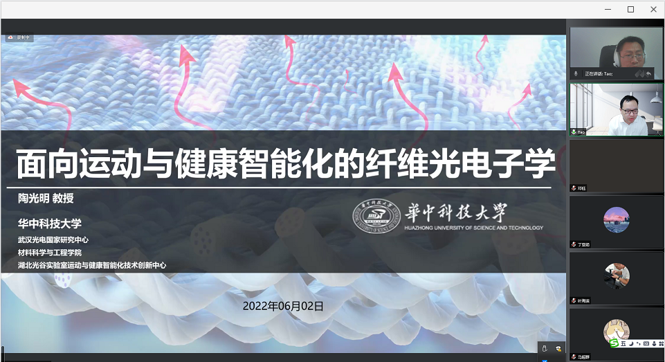 6月2日,應(yīng)我校輕工科學(xué)與工程學(xué)院、科技處及前沿院邀請(qǐng),華中科技大學(xué)陶光明教授做客我?!扒把乜茖W(xué)報(bào)告”,作了題為“面向運(yùn)動(dòng)與健康智能化的纖維光電子技術(shù)研究”的線上學(xué)術(shù)報(bào)告,報(bào)告會(huì)由輕工學(xué)院薛朝華教授主持,學(xué)院部分教師及研究生聆聽(tīng)了此次報(bào)告。