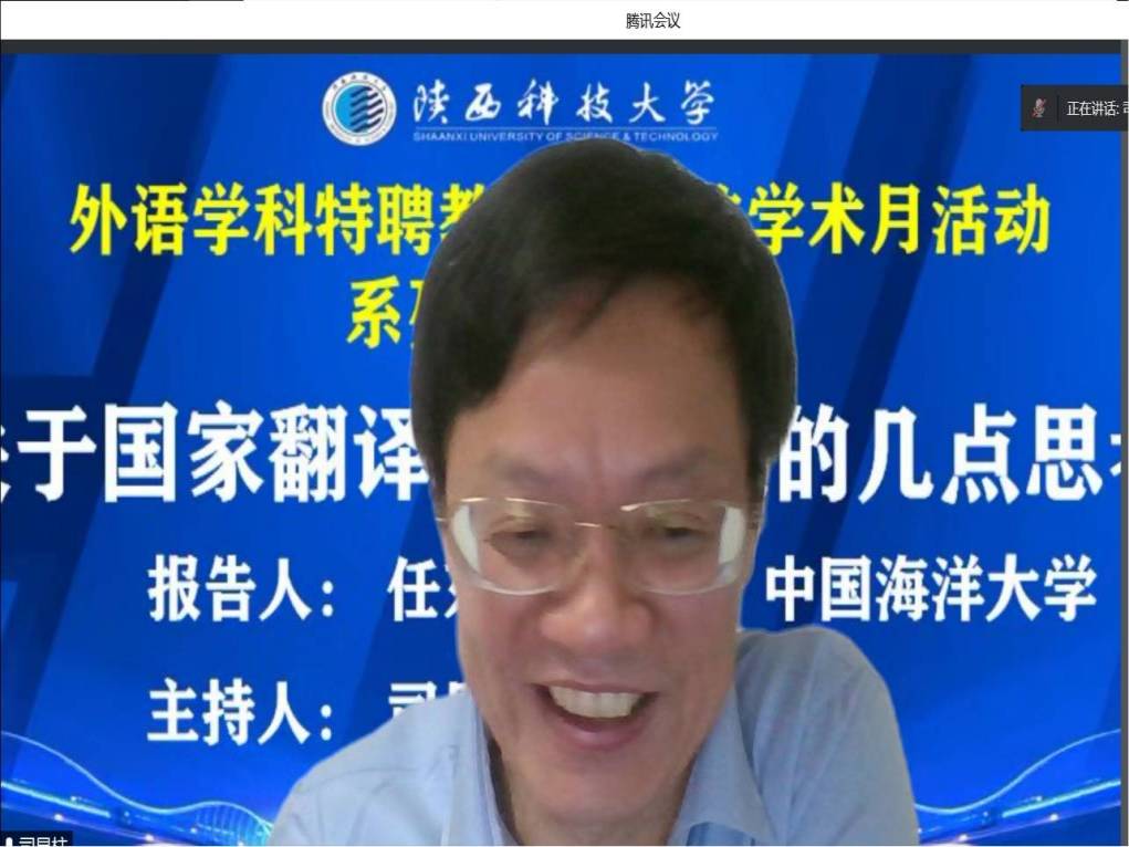 6月9日晚,中國海洋大學(xué)任東升教授應(yīng)邀做客我?!扒把貙W(xué)科報告”,作為我校文理學(xué)院外語學(xué)科特聘教授司顯柱學(xué)術(shù)月活動系列講座首位開講嘉賓,做了題為“關(guān)于國家翻譯實踐研究的幾點思考”的線上報告。報告由司顯柱教授主持,文理學(xué)院師生150余人聆聽了此次報告。文理學(xué)院6月組織開展的外語學(xué)科特聘教授司顯柱學(xué)術(shù)活動系列講座,旨在充分發(fā)揮我校特聘教授學(xué)術(shù)引領(lǐng)和資源共享作用,推動我校外語學(xué)科內(nèi)涵發(fā)展。