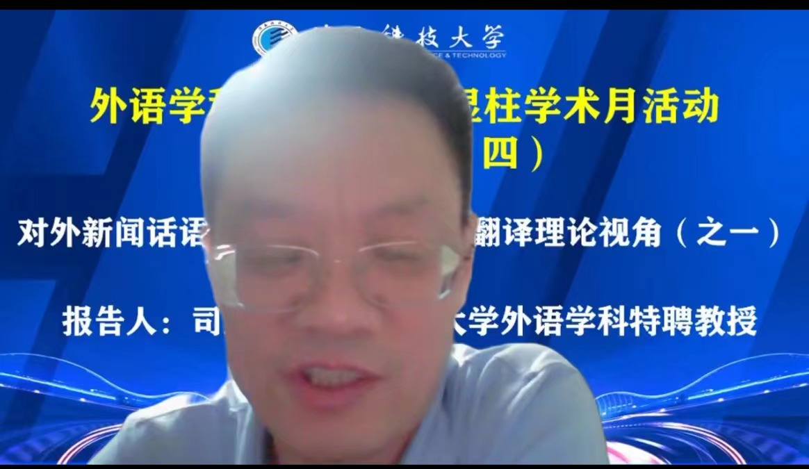 6月16日,我校特聘教授、北京第二外國語學(xué)院高翻學(xué)院院長司顯柱作了題為“對外新聞話語分析——功能路徑翻譯理論視角(之一)”的線上報(bào)告。報(bào)告由我校文理學(xué)院副院長李穩(wěn)敏主持,170余人聆聽了此次報(bào)告。文理學(xué)院6月組織開展的外語學(xué)科特聘教授司顯柱學(xué)術(shù)活動系列講座,旨在充分發(fā)揮我校特聘教授學(xué)術(shù)引領(lǐng)和資源共享作用,推動我校外語學(xué)科內(nèi)涵發(fā)展。