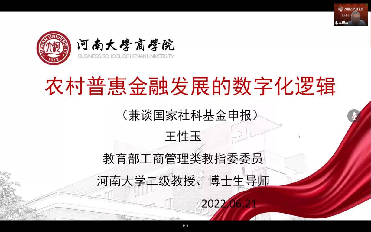 6月21日,應我校科技處、經(jīng)濟與管理學院邀請,河南大學商學院院長王性玉教授做客我?!扒把乜茖W報告”,為我校師生帶來主題為“農(nóng)村普惠金融發(fā)展的數(shù)字化邏輯--兼談國家社科基金申報”的線上報告。報告由經(jīng)管學院副院長薛儉主持,經(jīng)管學院教師、研究生代表聆聽了此次報告。
