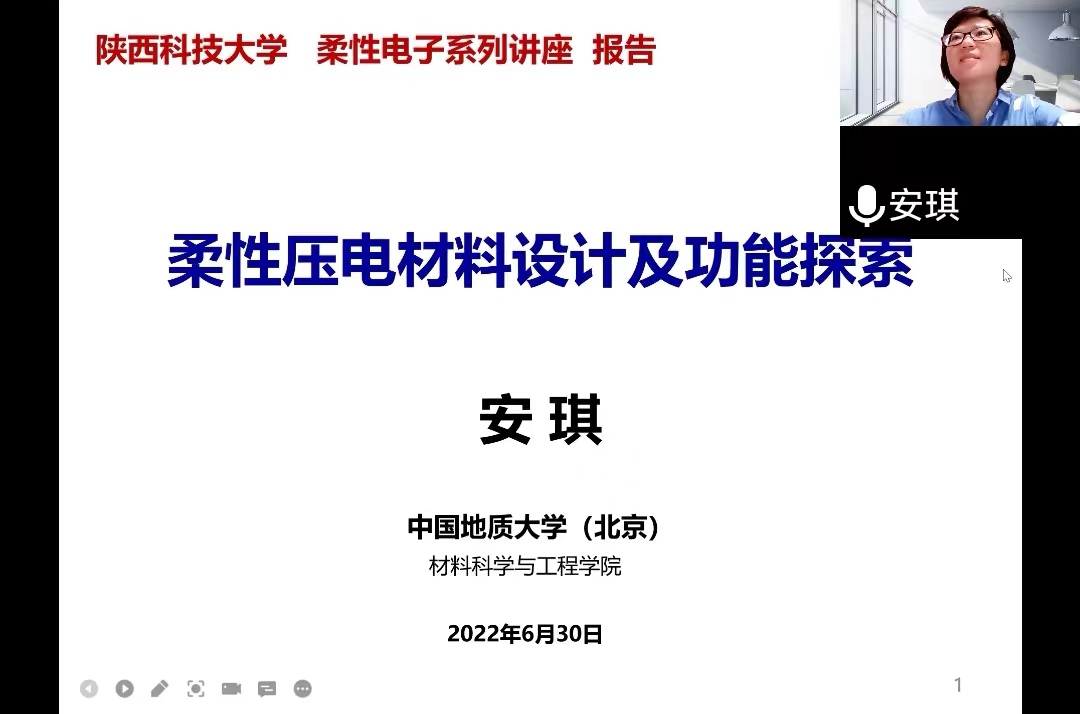 6月30日晚,應(yīng)我校輕工科學(xué)與工程學(xué)院、科技處及前沿院邀請,中國地質(zhì)大學(xué)(北京)安琪教授做客我?!扒把乜茖W(xué)報告”,作了題為“柔性壓電材料設(shè)計及功能探索”的線上學(xué)術(shù)報告。報告會由輕工學(xué)院呂生華教授主持,輕工學(xué)院相關(guān)專業(yè)教師及研究生參加了報告會。