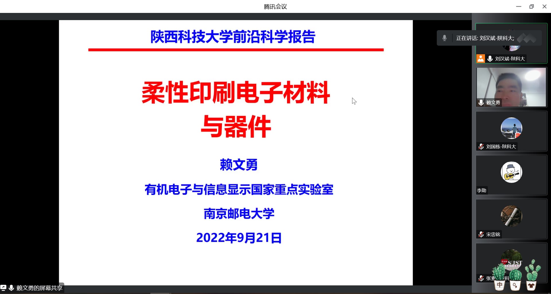 9月21日,應(yīng)我??萍继帯⑤p工科學(xué)與工程學(xué)院(柔性電子學(xué)院)及前沿院邀請(qǐng),南京郵電大學(xué)賴文勇教授做客我校“前沿科學(xué)報(bào)告”,作了題為“柔性印刷電子材料與器件”的線上學(xué)術(shù)報(bào)告。報(bào)告由輕工學(xué)院副院長(zhǎng)劉國(guó)棟主持,學(xué)院相關(guān)專業(yè)教師、研究生參加了此次報(bào)告會(huì)。