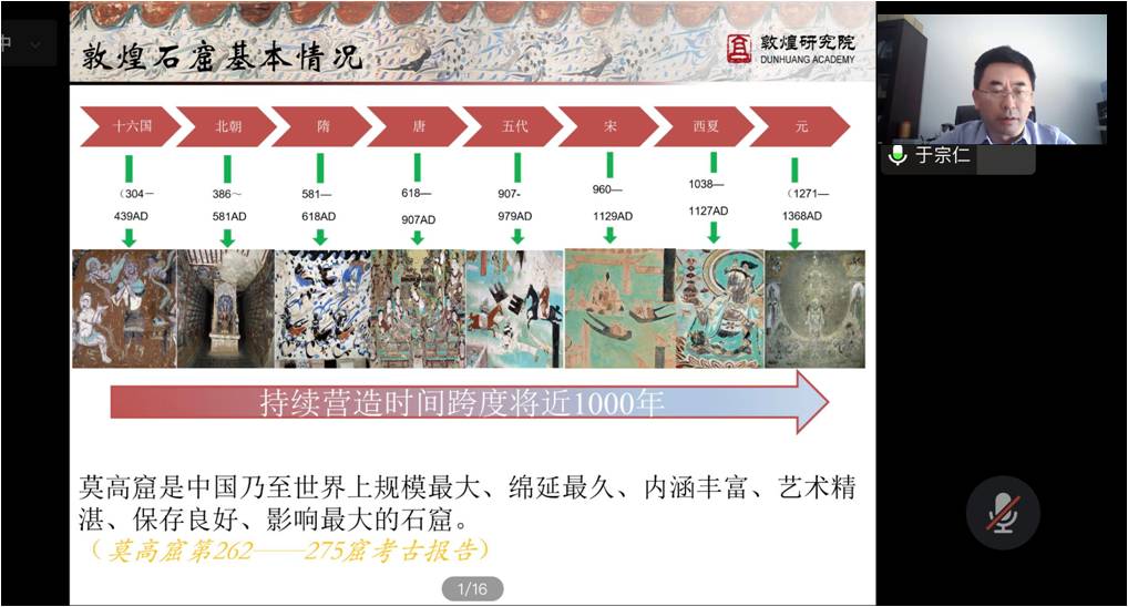 10月20日,應(yīng)我??萍继?、材料科學(xué)與工程學(xué)院(文物保護(hù)科學(xué)與技術(shù)學(xué)院)邀請,敦煌研究院于宗仁研究館員做客我?!扒把乜茖W(xué)報告”,作了題為“敦煌石窟壁畫材料、工藝和病害概況”的線上學(xué)術(shù)報告。報告由材料學(xué)院院長朱建鋒教授主持,學(xué)院相關(guān)領(lǐng)域教師和研究生參加了此次報告會。
