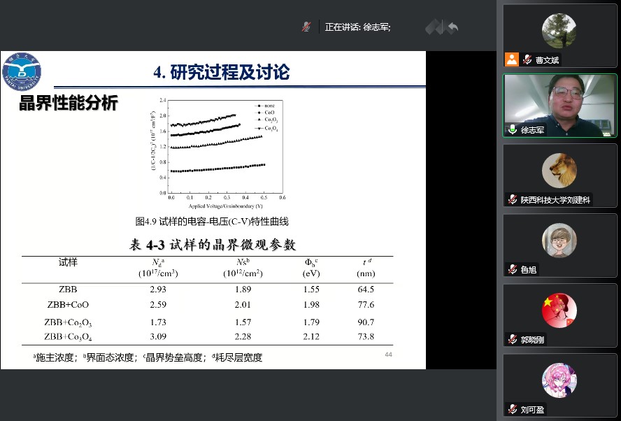 報(bào)告中,徐志軍教授從ZnO基壓敏陶瓷的基本概念、研究背景和研究現(xiàn)狀出發(fā),詳細(xì)分析了其缺陷特征和導(dǎo)電機(jī)理。在此基礎(chǔ)上,以制備純銀內(nèi)電極多層片式ZnO基壓敏陶瓷器件為研究目標(biāo),重點(diǎn)介紹了報(bào)告人所在課題組近幾年在低溫?zé)Y(jié)低壓高性能ZnO基壓敏陶瓷方面所做的工作。通過(guò)添加燒結(jié)助劑來(lái)降低壓敏陶瓷的燒結(jié)溫度,但燒結(jié)溫度降低的同時(shí),由于摻雜劑與ZnO之間會(huì)發(fā)生化學(xué)反應(yīng),導(dǎo)致晶界氧空位含量較低,從而影響了晶界吸附氧的傳輸,不利于晶界雙肖特基勢(shì)壘的提高及非線性電學(xué)性能的優(yōu)化。基于此,課題組進(jìn)行了預(yù)合成富鉍相摻雜,實(shí)驗(yàn)表明,這在加快液相傳質(zhì),促進(jìn)缺陷反應(yīng),減少氧空位消耗,提高晶界勢(shì)壘,改善ZnO基壓敏陶瓷的非線性系數(shù)等電學(xué)性能方面效果明顯。