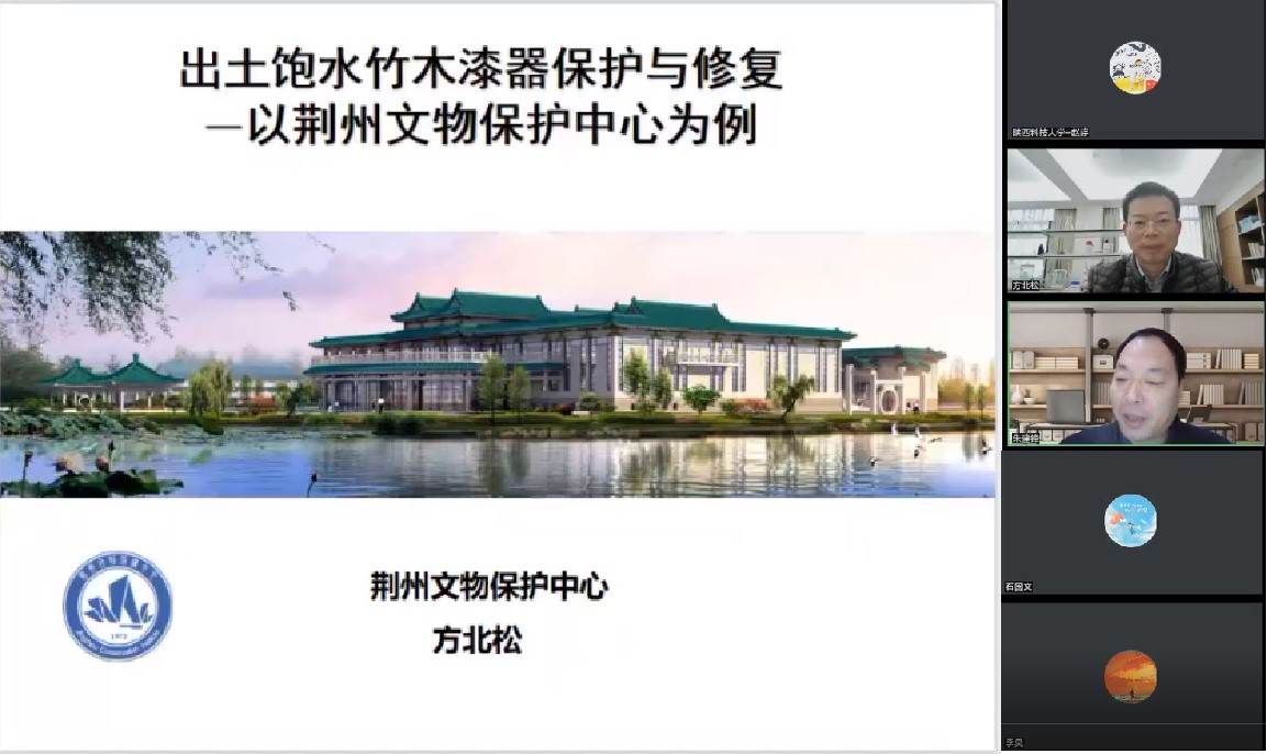 方北松研究館員從竹木漆器基本種類、竹木漆器的保護(hù)、漆器復(fù)原研究及竹木漆器保護(hù)最新研究四個(gè)方面,專業(yè)且系統(tǒng)地講解了飽水漆木器的出土——修復(fù)——完善全過(guò)程所使用的理念、方法及材料,帶領(lǐng)與會(huì)師生感受千年古人的藝術(shù)造詣與現(xiàn)代文物修復(fù)的不斷進(jìn)步與發(fā)展。