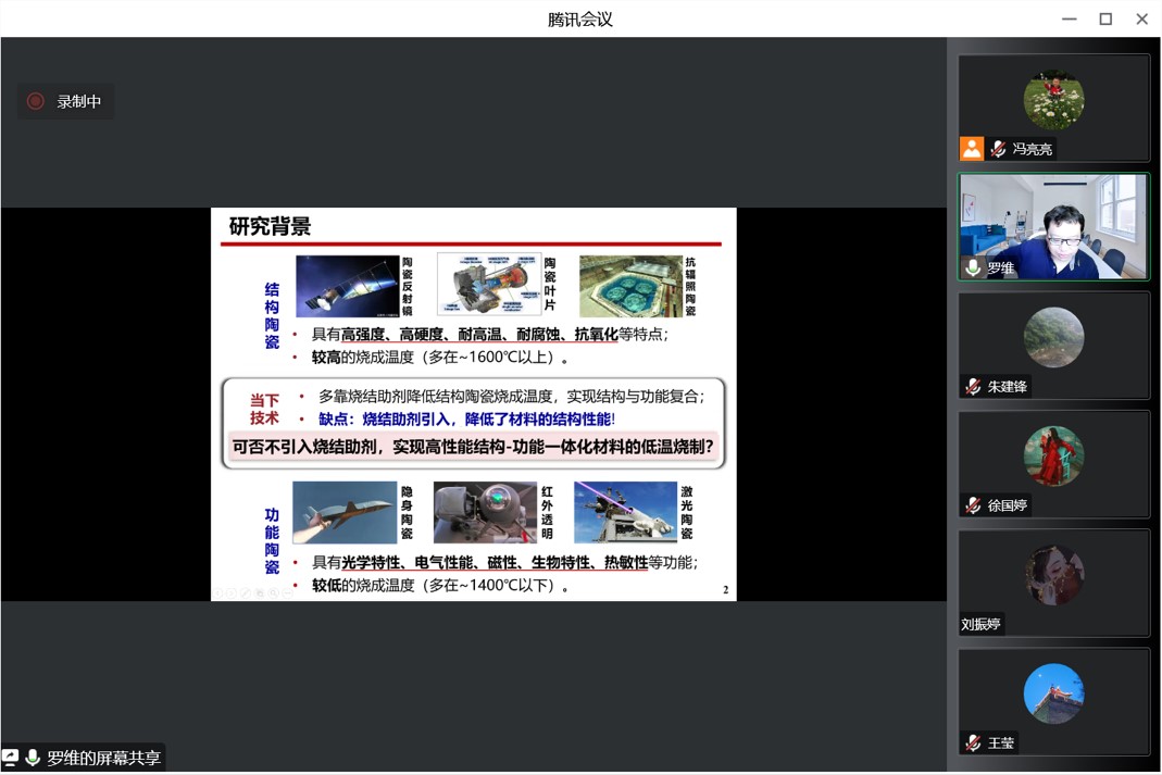 羅維研究員的講座主要聚焦高活性介孔粉體的可控制備及燒結(jié)應(yīng)用探索這一全新領(lǐng)域,借助納米粉體的高表面活性,降低燒結(jié)溫度、制備高性能玻璃與納米晶塊體材料。提出利用微米級介孔粉體的空間限域以及可坍塌成納米級高燒結(jié)活性碎片的特性,低溫燒結(jié)可控制備結(jié)構(gòu)-功能一體化塊體材料的新思路,進一步拓展了介孔材料的應(yīng)用領(lǐng)域,探索了一條高溫結(jié)構(gòu)材料低溫制備的新途徑。報告結(jié)束后,羅維研究員與參會師生進行了相關(guān)研究課題的研討,并對材料學院部分相關(guān)研究領(lǐng)域的基金申請書進行了在線指導(dǎo),參會師生都表示受益匪淺。
