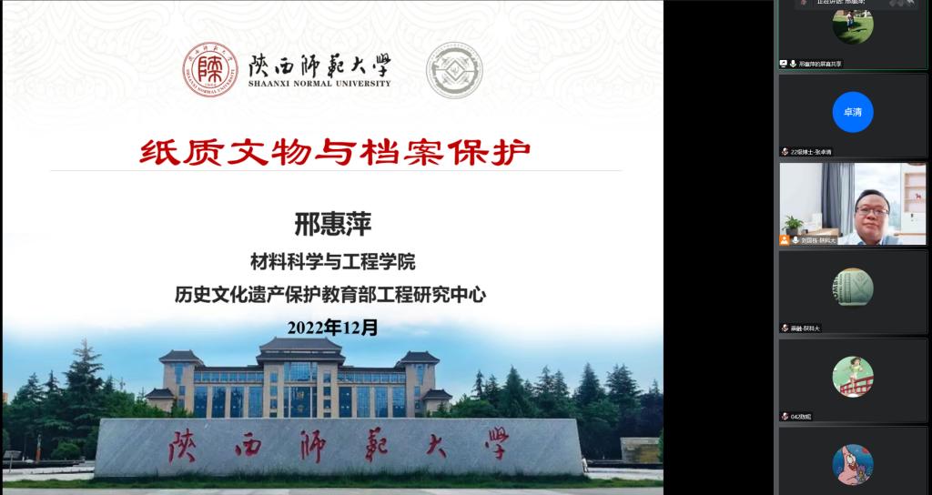 應輕工科學與工程學院和研究生院邀請,陜西省產(chǎn)品質(zhì)量監(jiān)督檢驗研究院建材輕工所副所長王思宇、陜西師范大學副教授邢惠萍分別于12月10日、12月9日做客我?!拔囱雽熣搲?,分別作了題為“食品包裝材料質(zhì)量安全檢測技術”“紙質(zhì)文物與檔案保護”的線上學術報告。學院相關專業(yè)教師、研究生及本科生參加了報告會。
