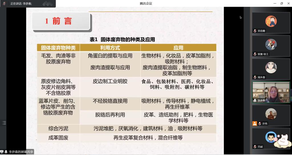 應輕工科學與工程學院和研究生院邀請,中國皮革協(xié)會副秘書長路華、齊魯工業(yè)大學李彥春教授分別于12月15日、12月19日做客我?!拔囱雽熣搲保謩e作了題為“從鞋業(yè)看皮革等鞋用材料發(fā)展”“制革固體廢棄物的資源化利用”的線上學術報告。學院相關專業(yè)教師、研究生及本科生參加了報告會。
