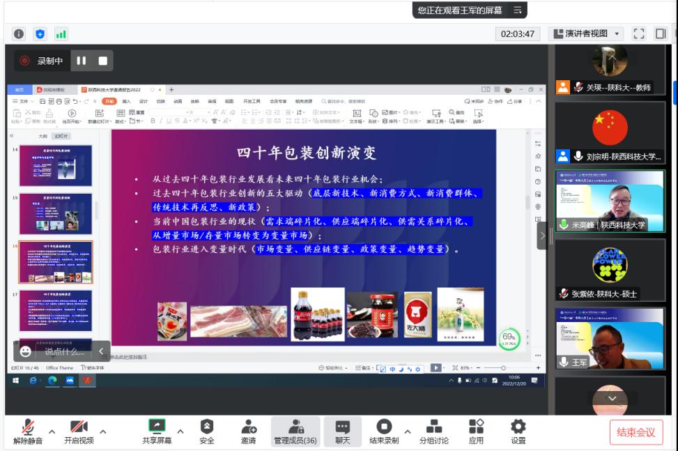 王軍教授還就Packaging Technology and Science雜志的論文選題、投稿要求、審稿規(guī)則、研究問(wèn)題等與參會(huì)師生進(jìn)行深入交流,為師生們?cè)谖磥?lái)包裝設(shè)計(jì)領(lǐng)域的前沿問(wèn)題、創(chuàng)新方法、評(píng)價(jià)體系等提供了諸多參考和啟發(fā)。