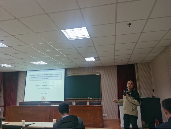 3月22日下午,應(yīng)我校文理學(xué)院、科技處及前沿院邀請,重慶師范大學(xué)文林教授做客我校“前沿科學(xué)報(bào)告”,作了題為“自旋-張量-動(dòng)量耦合玻色-愛因斯坦凝聚體中的自旋-向列亮孤子動(dòng)力學(xué)”的學(xué)術(shù)報(bào)告。報(bào)告會(huì)由文理學(xué)院院長劉建科主持,文理學(xué)院物理系師生及我校相關(guān)專業(yè)師生近百人參加了此次報(bào)告會(huì)。