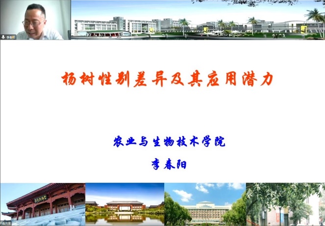 李春陽為與會(huì)師生作了題為“楊樹性別差異及其應(yīng)用潛力”的學(xué)術(shù)報(bào)告,他首先介紹了雌雄異株植物的重要性,進(jìn)而以青楊為例闡釋了雌雄異株植物形態(tài)、生理、生化和亞細(xì)胞結(jié)構(gòu)對(duì)干旱、重金屬等環(huán)境脅迫因素的響應(yīng)規(guī)律及其交互作用。報(bào)告會(huì)尾聲,李春陽教授與在場師生進(jìn)行了深入的交流討論,并耐心地解答了相關(guān)問題,拓寬了師生的科研思路與視野。