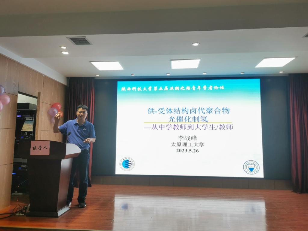 5月26日下午,應(yīng)我校輕工科學(xué)與工程學(xué)院(柔性電子學(xué)院)、科技處及前沿院的邀請(qǐng),太原理工大學(xué)李戰(zhàn)峰教授做客我?!扒把乜茖W(xué)報(bào)告”,作了題為“供-受體結(jié)構(gòu)鹵代聚合物光催化制氫”的學(xué)術(shù)報(bào)告。報(bào)告由輕工學(xué)院副院長劉國棟主持,我校相關(guān)專業(yè)教師、研究生參加了此次報(bào)告會(huì)。