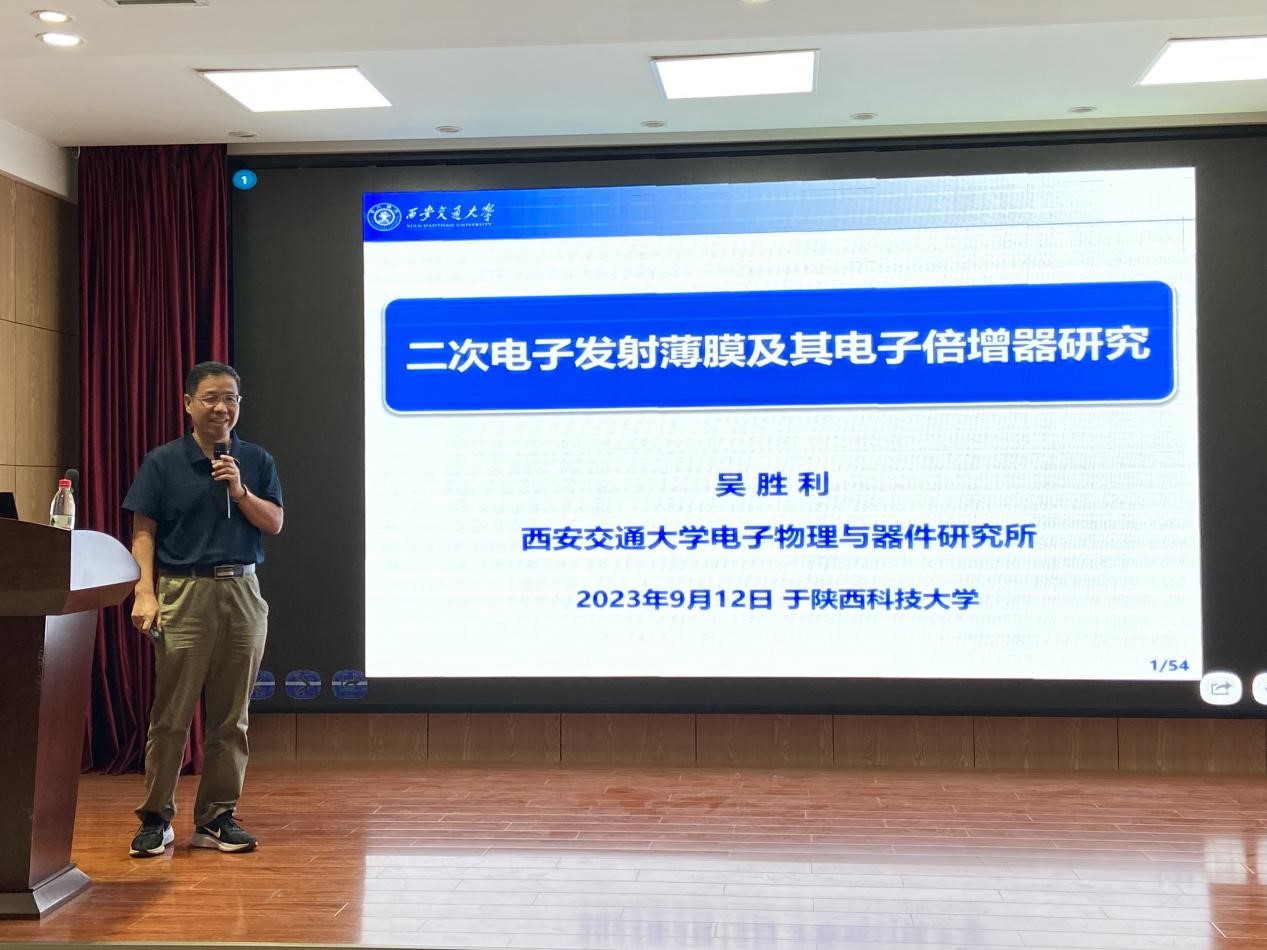 9月12日上午,應我校輕工科學與工程(柔性電子)學院、科技處及前沿院邀請,西安交通大學電子物理與器件研究所吳勝利教授做客我校“前沿科學報告”,作了題為“二次電子發(fā)射薄膜與其電子倍增器研究”的學術報告。報告會由輕工學院院長助理游翔宇主持,學院相關專業(yè)教師、研究生參加了此次報告會。