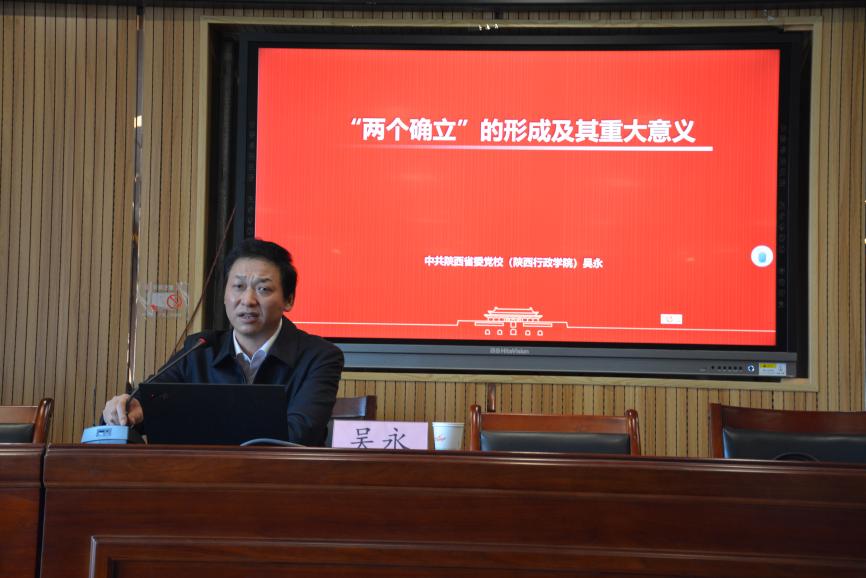 為了進(jìn)一步學(xué)習(xí)貫徹黨的二十大精神,深刻領(lǐng)會(huì)“兩個(gè)確立”的決定性意義,明確中國式現(xiàn)代化新道路的理論特點(diǎn),馬克思主義學(xué)院邀請(qǐng)中共陜西省委黨校(陜西行政學(xué)院)副校長吳永教授于10月8日在馬院學(xué)術(shù)報(bào)告廳作了題為《“兩個(gè)確立”的形成及重大意義》的“前沿科學(xué)報(bào)告”。講座由院長吳明永主持,馬院全體師生參加了學(xué)習(xí)。