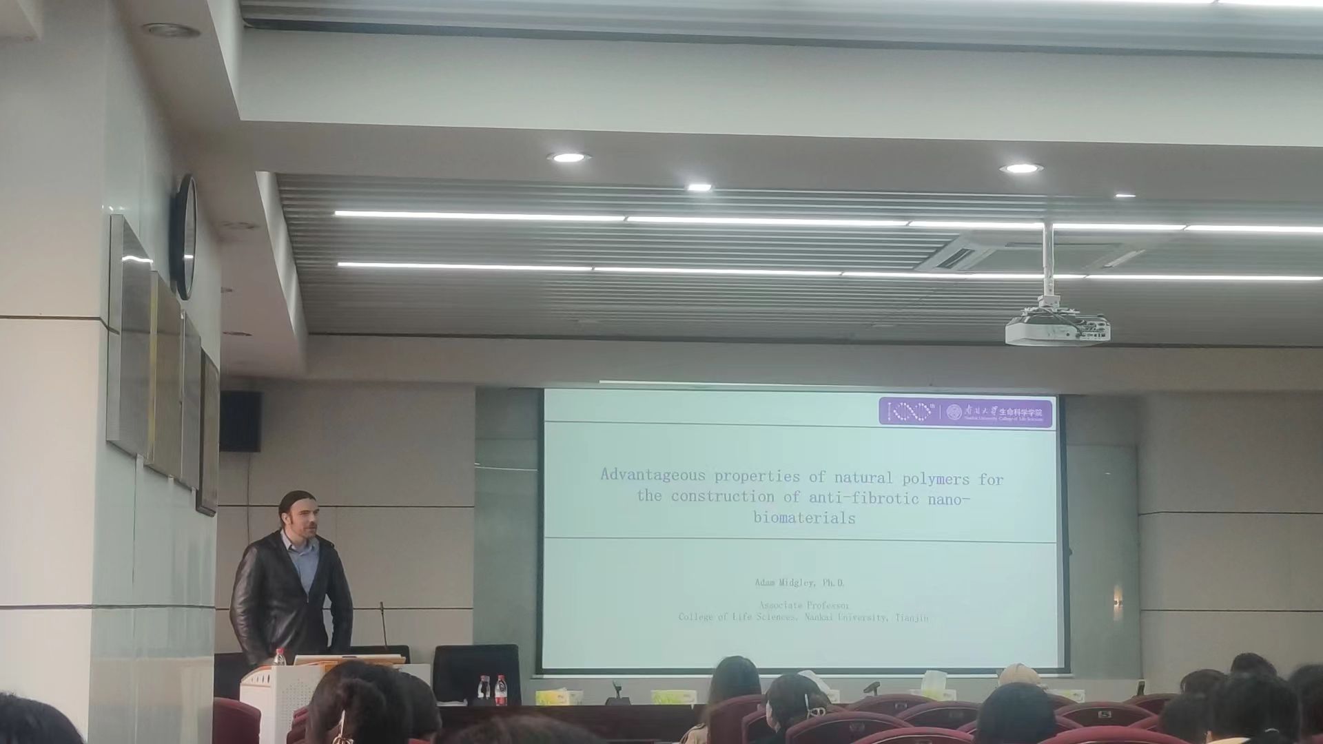 12月8日下午,應(yīng)我校科技處和食品科學(xué)與工程學(xué)院(生物與醫(yī)藥學(xué)院)邀請(qǐng),南開(kāi)大學(xué)Adam C. Midgley副教授做客我?!扒把乜茖W(xué)報(bào)告”,作了題為“Advantageous properties of natural polymers for the construction of antifibrotic nano-biomaterials”的報(bào)告。食品學(xué)院部分教師和研究生代表參加本次報(bào)告會(huì),報(bào)告會(huì)由食品學(xué)院學(xué)術(shù)委員會(huì)主任姚曉琳教授主持。