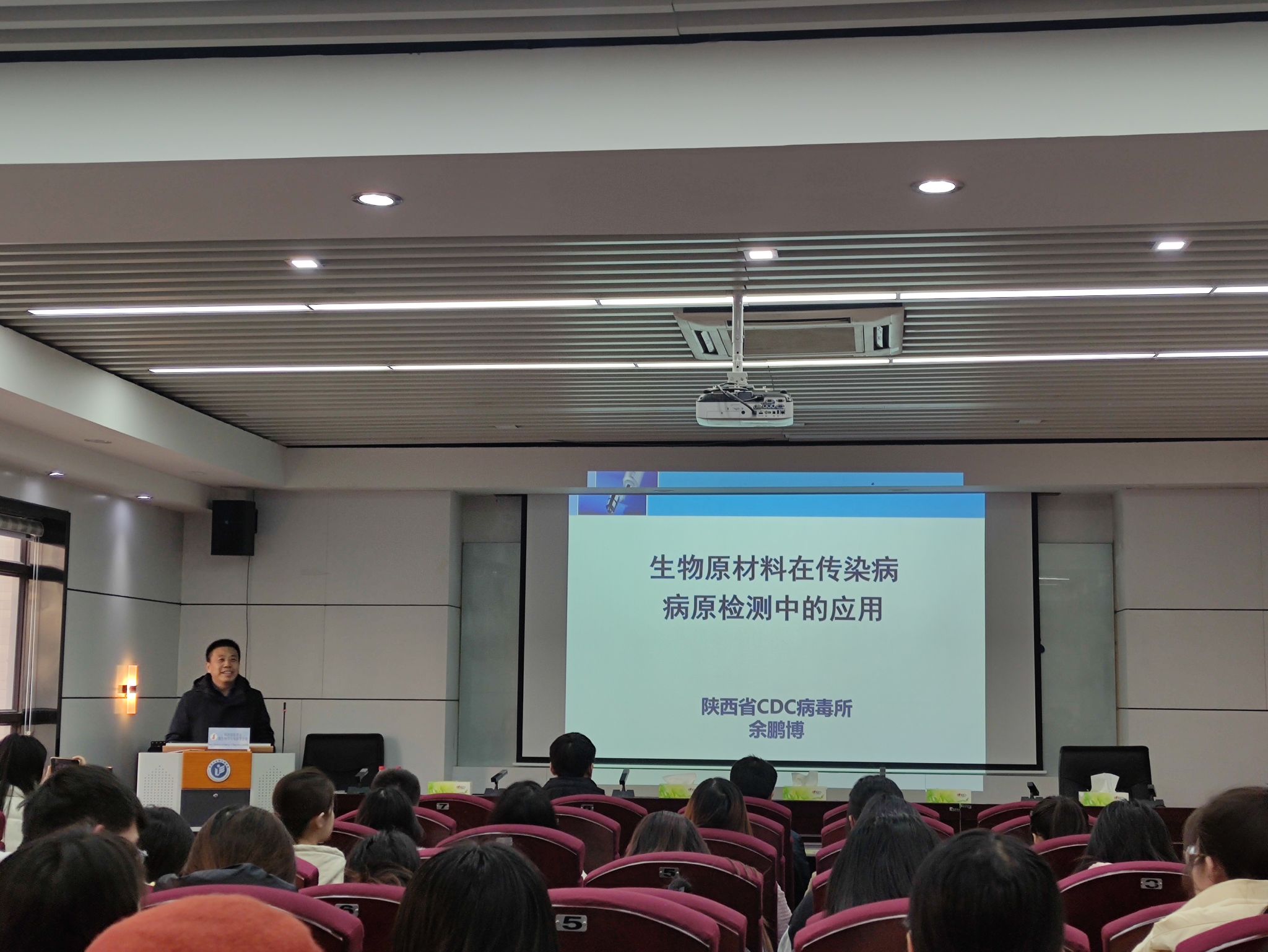 近日,應(yīng)??萍继幒褪称房茖W(xué)與工程學(xué)院(生物與醫(yī)藥學(xué)院)邀請(qǐng),陜西省疾病預(yù)防控制中心病毒所所長(zhǎng)余鵬博教授作了題為“生物原材料在傳染病病原檢測(cè)中的應(yīng)用”的學(xué)術(shù)報(bào)告。食品學(xué)院部分教師和全體研究生參加本次報(bào)告會(huì),報(bào)告會(huì)由食品學(xué)院院長(zhǎng)助理劉寧主持。
