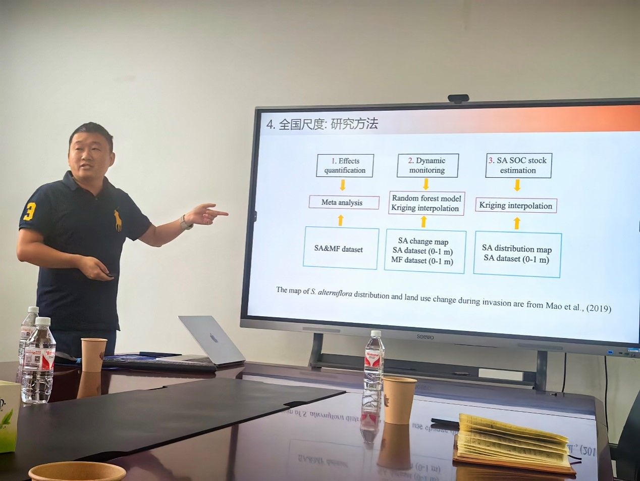7月30日,應我校科技處、前沿院、環(huán)境科學與工程學院(碳中和科學與技術學院)邀請,中國科學院華南植物園王法明研究員做客我校“前沿科學報告”,并作了題為“互花米草入侵的藍碳碳匯效應”的學術報告,報告會由環(huán)境學院院長郭軍康教授主持,相關教師及研究生參加了此次報告會。