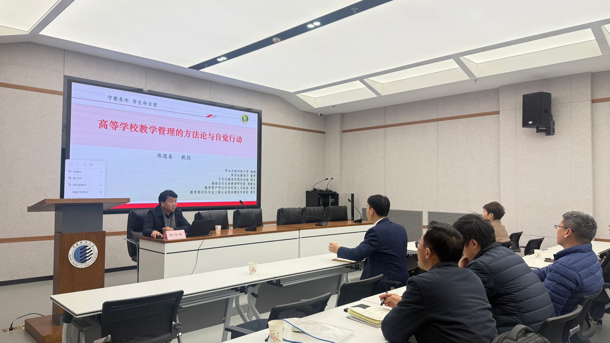 11月19日下午,應(yīng)教務(wù)處邀請,西北農(nóng)林科技大學(xué)陳遇春教授做客我校“教育教學(xué)論壇”,面向我校教學(xué)管理人員作了題為“高等學(xué)校教學(xué)管理的方法論與自覺實踐”的專題報告。報告由教務(wù)處處長楊海波主持。本次活動由教務(wù)處主辦,教師發(fā)展中心聯(lián)合開展。