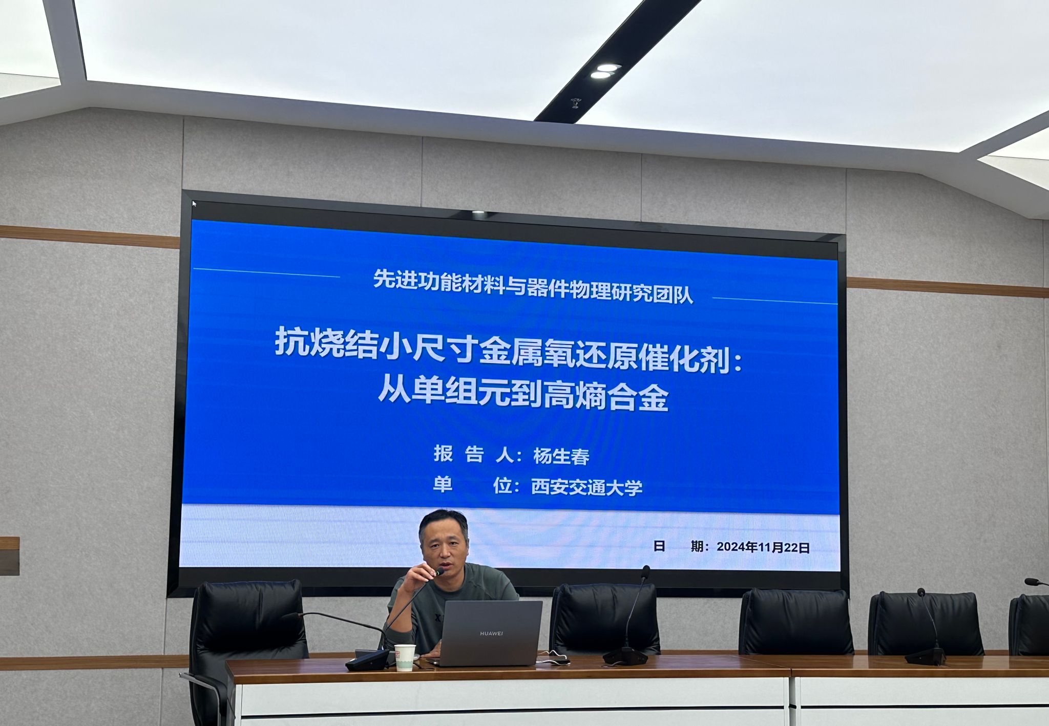 11月22日下午,應(yīng)我校科技處、前沿院和材料科學(xué)與工程學(xué)院(文物保護(hù)科學(xué)與技術(shù)學(xué)院)邀請(qǐng),西安交通大學(xué)楊生春教授做客我?!扒把乜茖W(xué)報(bào)告”,做了題為“抗燒結(jié)小尺寸金屬氧還原催化劑:從單組元到高熵合金”的學(xué)術(shù)報(bào)告,報(bào)告由材料學(xué)院伍媛婷教授主持,學(xué)院相關(guān)教師和研究生參加了此次學(xué)術(shù)講座。
