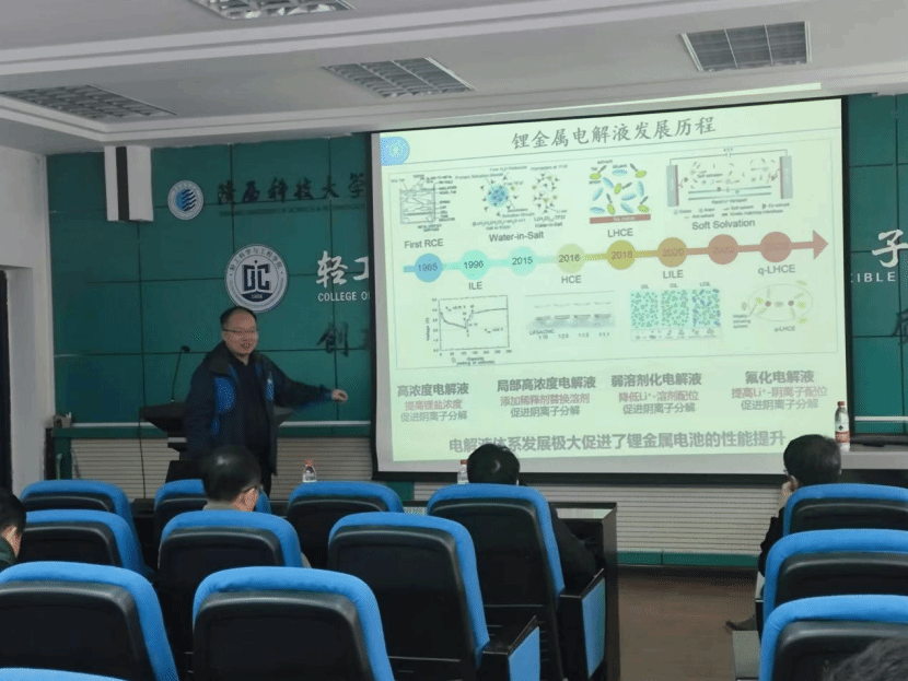 宋江選教授的學(xué)術(shù)報告展示了他在高比能鋰金屬電池設(shè)計與應(yīng)用探索方面的研究進展,對我校師生今后研究方向的拓展有很好的啟發(fā)性。報告最后,宋江選教授還與參會師生就報告內(nèi)容進行了深入的討論和交流,并對高比能鋰金屬電池設(shè)計與應(yīng)用方向提出了新的見解。
