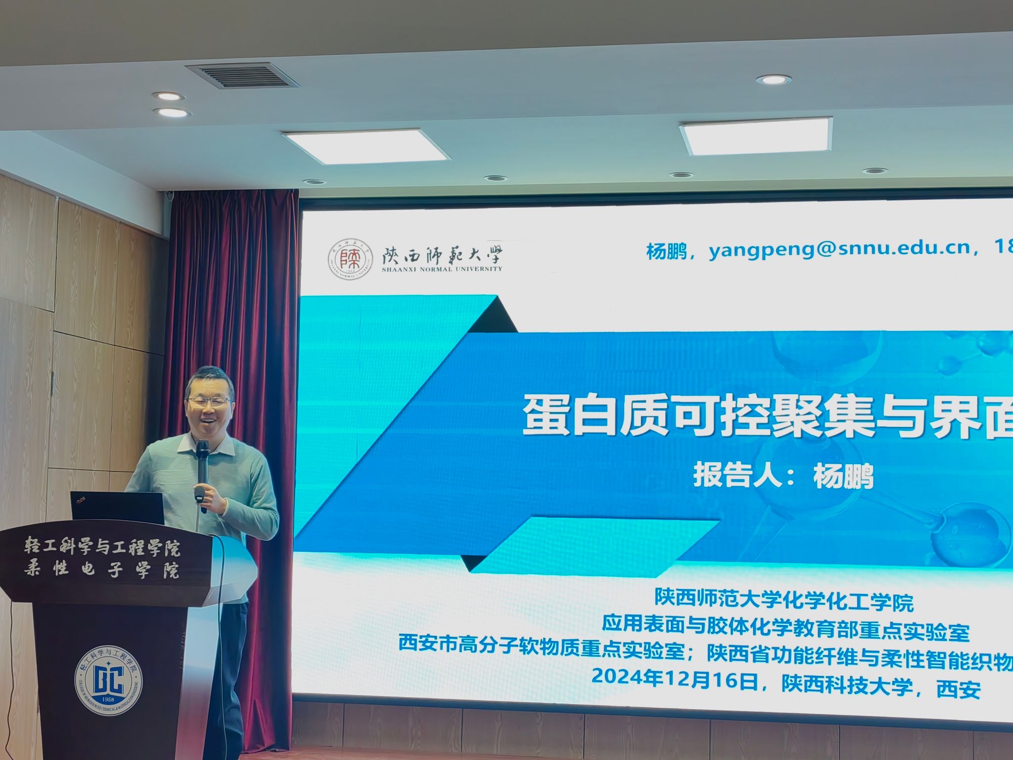12月16日,為進(jìn)一步促進(jìn)學(xué)術(shù)交流和合作,拓寬師生的學(xué)術(shù)視野。應(yīng)我校輕工科學(xué)與工程學(xué)院(柔性電子學(xué)院)、國(guó)際合作與交流處及科技處邀請(qǐng),陜西師范大學(xué)楊鵬教授做客我校“前沿科學(xué)報(bào)告”,做了題為“基于蛋白質(zhì)聚集的生物質(zhì)材料”的學(xué)術(shù)報(bào)告。報(bào)告會(huì)由國(guó)際合作與交流處處長(zhǎng)張素風(fēng)主持。輕工學(xué)院相關(guān)專業(yè)師生參與了本次報(bào)告會(huì)。