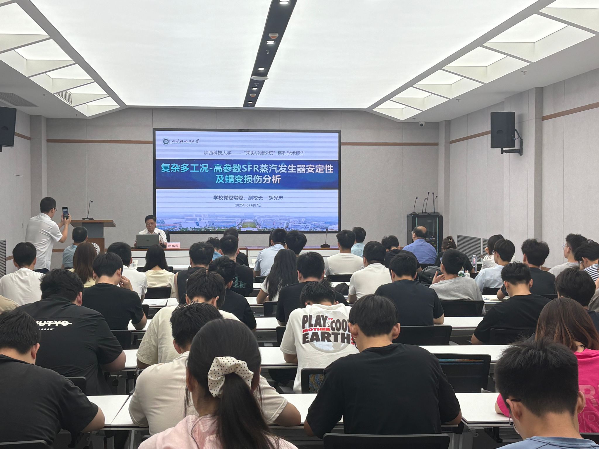 7月7日,應(yīng)研究生院和機電工程學(xué)院(智能制造與機器人工程學(xué)院)邀請,四川輕化工大學(xué)副校長胡光忠教授做客我?!拔囱雽?dǎo)師論壇”,作了題為“復(fù)雜多工況-高參數(shù)SFR蒸汽發(fā)生器安定性及蠕變損傷分析”的學(xué)術(shù)報告,報告會由研究生院院長強濤濤教授主持,機電學(xué)院院長楊立軍、副院長袁越錦及學(xué)院相關(guān)專業(yè)教師和研究生參加了本次報告會。