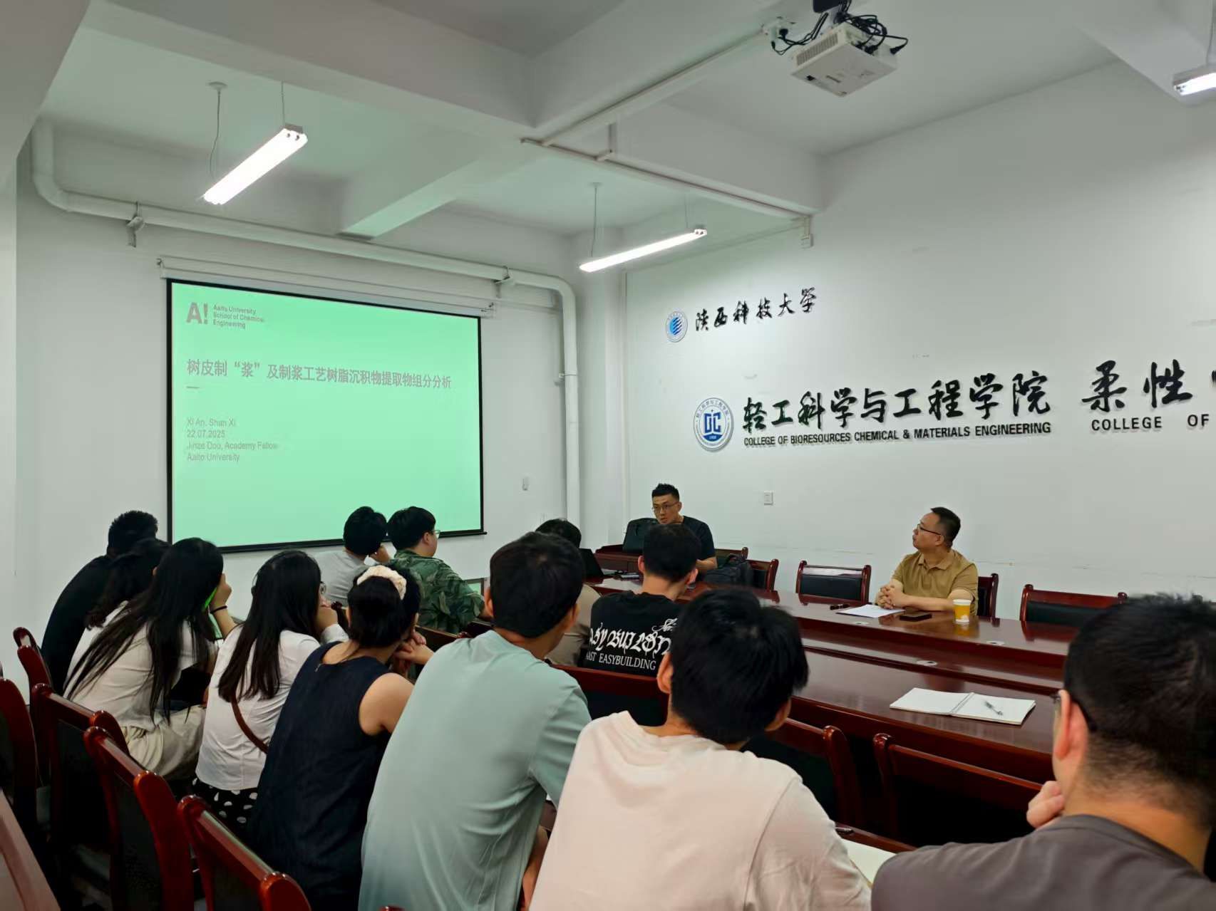 7月22日,應(yīng)學(xué)校輕工科學(xué)與工程學(xué)院(柔性電子學(xué)院)和研究生院邀請,芬蘭阿爾托大學(xué)竇金澤研究員做客我?!拔囱雽?dǎo)師論壇”,作了題為“樹皮制‘漿’及制漿工藝樹脂沉積物提取物組分分析”的學(xué)術(shù)報(bào)告。報(bào)告會(huì)由輕工學(xué)院副院長劉國棟主持,輕工學(xué)院相關(guān)專業(yè)教師和研究生參加了此次報(bào)告會(huì)。