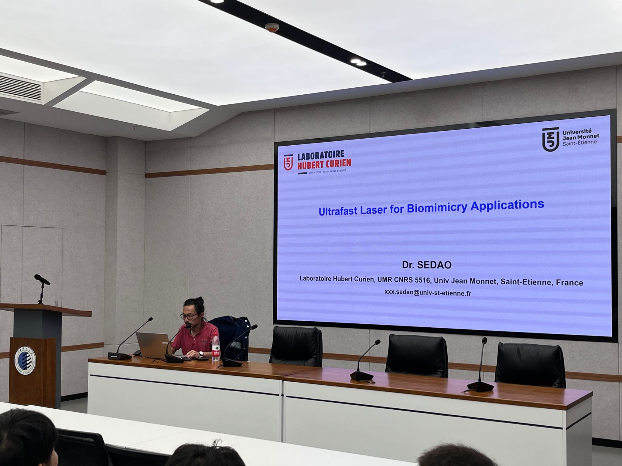9月1日的報(bào)告中,SEDAO教授以“Ultrafast Laser Processing: Applications Overview”為題,系統(tǒng)講解了超高速激光脈沖與材料的相互作用機(jī)制、表面功能化技術(shù)及工業(yè)化應(yīng)用路線,解析了核心技術(shù)原理與落地路徑,并結(jié)合增材制造、生物醫(yī)學(xué)等實(shí)例,展現(xiàn)了超快激光的廣泛應(yīng)用潛力。3日,他以“Ultrafast Laser for Biomimicry Applications”為題,圍繞仿生學(xué)展開,闡述了仿生學(xué)理念,介紹了自然啟發(fā)表面的功能特性及超快激光紋理化技術(shù),還解析了眼科生物源材料中激光與材料的相互作用等內(nèi)容。5日的“Pulsed-Laser for Direct Coloration of Metals”報(bào)告,闡述了激光與物質(zhì)相互作用原理、金屬表面顏色呈現(xiàn)(含結(jié)構(gòu)色與色素色的區(qū)別)及相關(guān)加工工藝,通過光捕獲黑色表面等實(shí)例體現(xiàn)了應(yīng)用價(jià)值。每場報(bào)告中,教授都與師生深入交流,解答技術(shù)難點(diǎn),引導(dǎo)多學(xué)科交叉思考,幫助師生了解前沿動態(tài),對提升學(xué)校相關(guān)領(lǐng)域國際化交流層次意義重大。