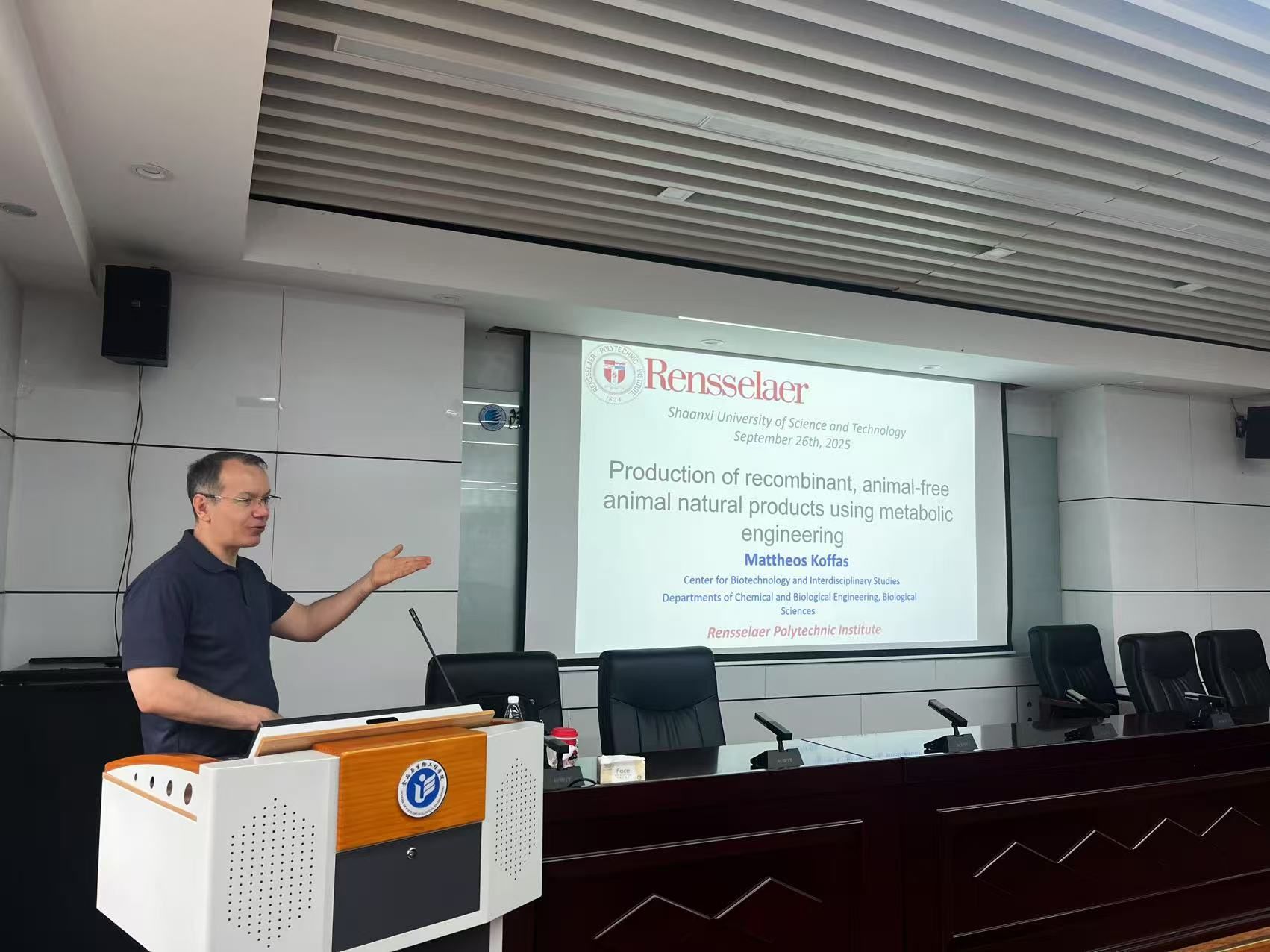 9月26日,應(yīng)我校國際合作與交流處、食品科學(xué)與工程學(xué)院(生物與醫(yī)藥學(xué)院)邀請,美國倫斯勒理工學(xué)院Mattheos Koffas教授做客我校“國際教育論壇”,來校交流訪問并做了題為“Production of recombinant, animal-free animal natural products using metabolic engineering”的學(xué)術(shù)報告。學(xué)院相關(guān)專業(yè)師生參加了本次報告會。